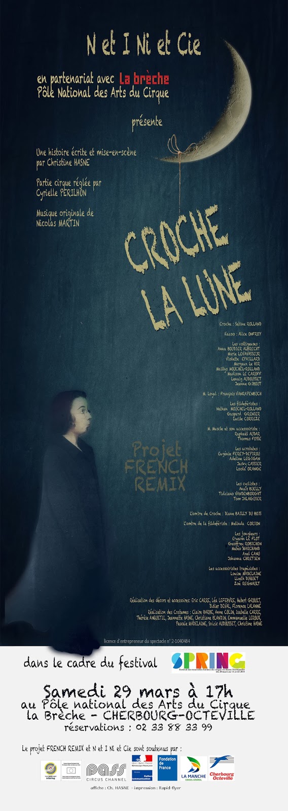 Depuis septembre 34 enfants et adolescents venant d’horizons divers : de l’Atelier de N et I Ni, du quartier du Maupas et d’un établissement spécialisé, se sont retrouvés tous les mercredis encadrés par Christine HASNE metteur en scène de N et I NI et Cyrielle PERILHON, artiste de cirque, pour découvrir les techniques de cirque et créer des personnages qui ont servi à la création d’un spectacle de théâtre aux allures de cirque: « Croche la lune« .