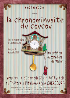 45 comédiens de 5 à 23 ans à l’intérieur d’un coucou suisse… A chacun sa tâche pour que le cliquet de la roue cliquette, la tige danse sous la fourchette… et pour qu’à chaque heure précise démarre une joyeuse farandole d’artistes musiciens : les « tempstermittents »….